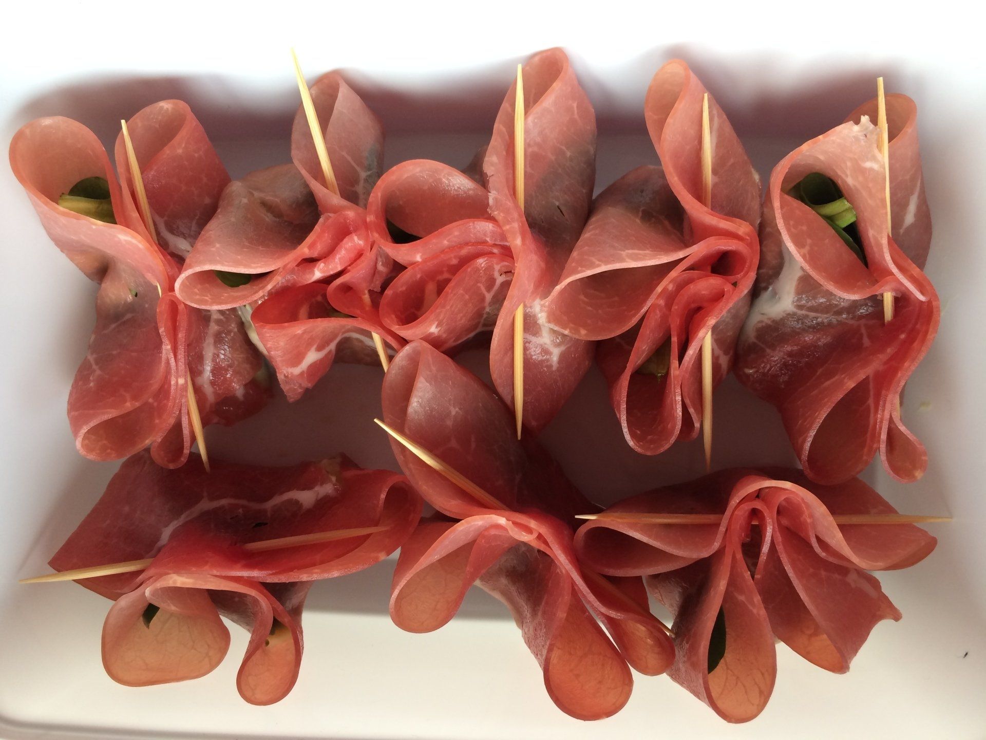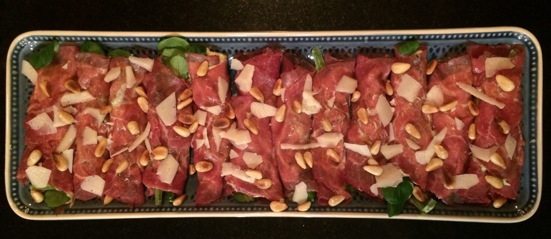 hoofdingrediënten: runderrookvlees, Parmezaan, pijnboompitten, pesto, room en veldsla