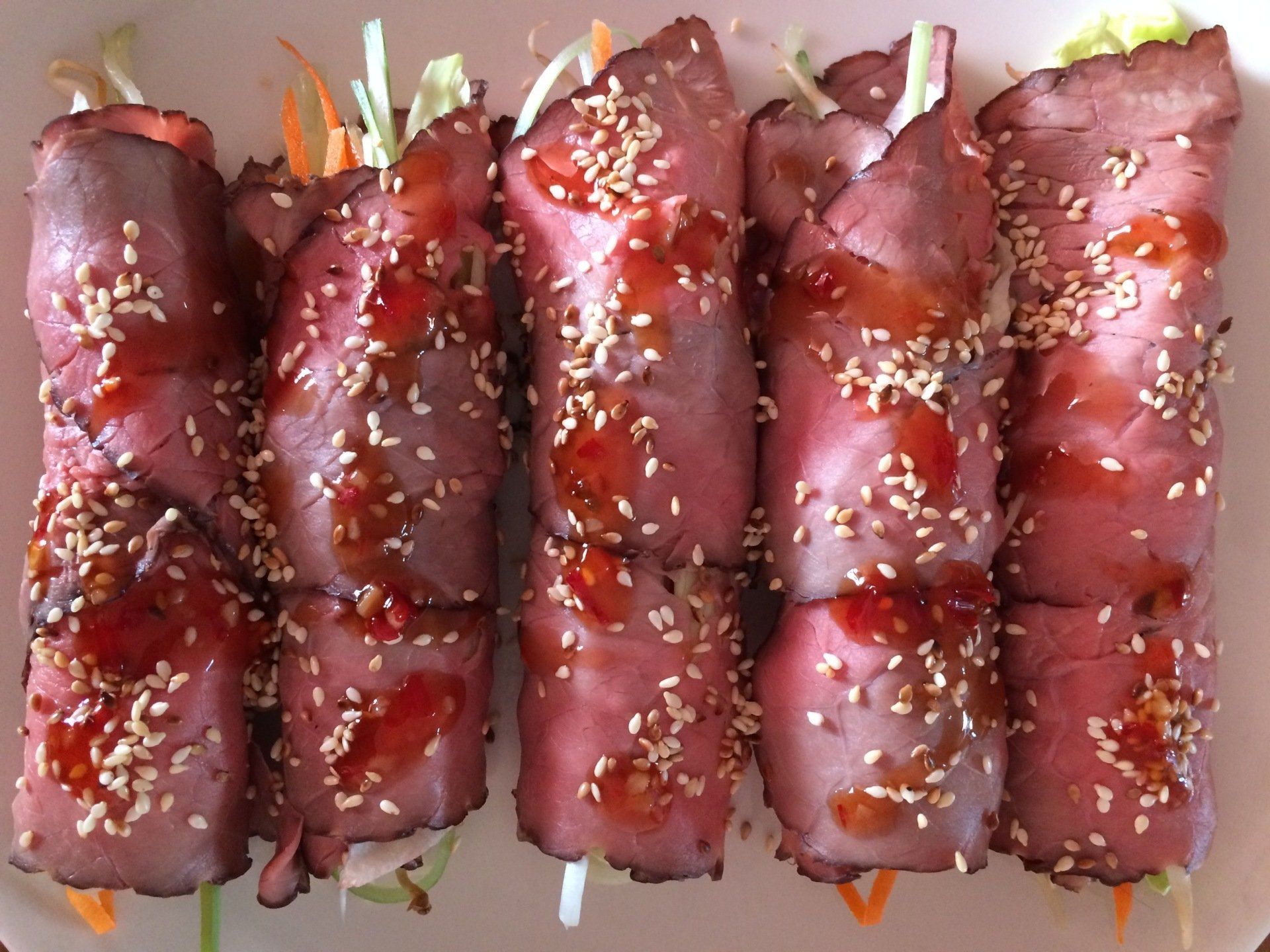 hoofdingrediënten: rosbief, mie, taugé, wortel, lente-ui en komkommer